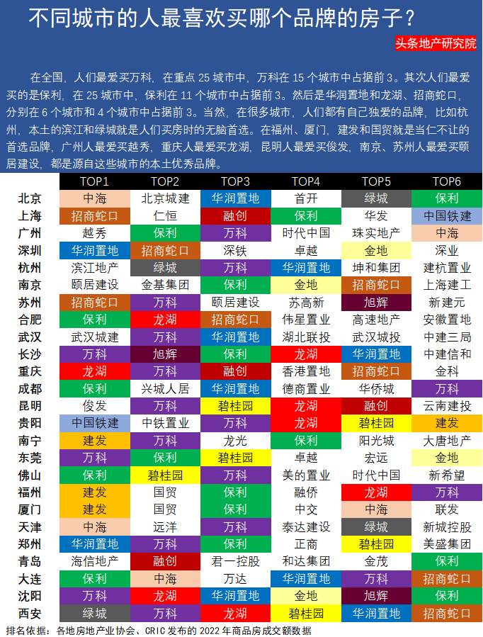 头条地产研究院梳理了全国25个一线和二线城市2022年的商品房成交数据,结合对部分商品房购房者的抽样调查,形成了各个城市最爱的地产品牌的一个排行,数据来自各地房地产业协会和数据研究机构CRIC等发布的成交数据。研究发现了很多有意思的现象。