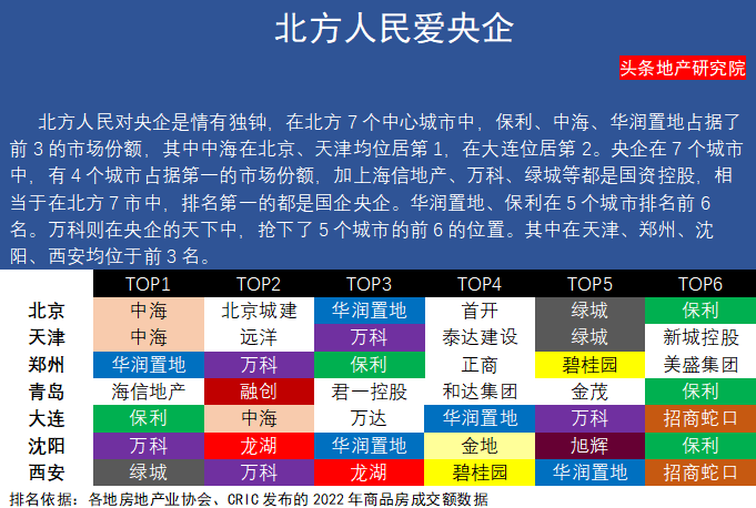 北方人民对央企是情有独钟,在北方7个中心城市中,保利、中海、华润置地占据了前3的市场份额,其中中海在北京、天津均位居第1,在大连位居第2。央企在7个城市中,有4个城市占据第一的市场份额,加上海信地产、万科、绿城等都是国资控股,相当于在北方7市中,排名第一的都是国企央企。华润置地、保利在5个城市排名前6名。万科则在央企的天下中,抢下了5个城市的前6的位置。其中在天津、郑州、沈阳、西安均位于前3名。