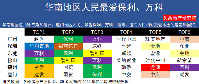 经过2021年-2022年的房地产行业爆雷潮,粤系、闽系的众多房企相继倒下,恒大、花样年、佳兆业、富力、泰禾、阳光城、正荣、融信等相继财务爆雷。繁花散尽,华南地区人们在购房的选择上,仍然青睐本土的房企,然而,在选择的时候,对本土的国企地产品牌的信任感空前增强。可以看出,珠三角的人们最爱保利、万科、越秀、华润置地、招商蛇口等总部位于广州、深圳的央企和本土国企,福州、厦门人民相对更爱建发和国贸这两大本土国企。