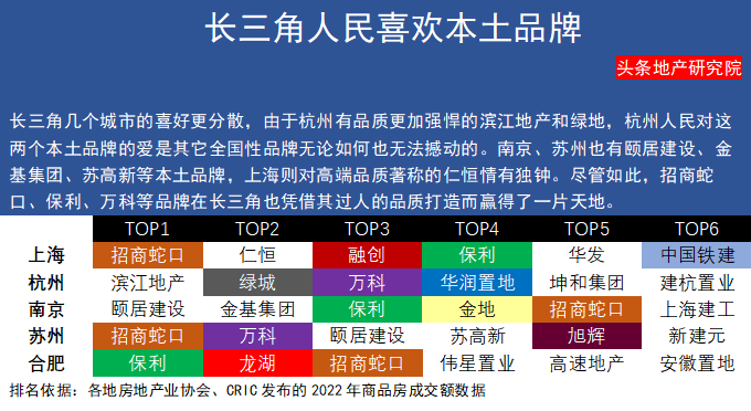 长三角几个城市的喜好更分散,由于杭州有品质更加强悍的滨江地产和绿城,杭州人民对这两个本土品牌的爱是其它全国性品牌无论如何也无法撼动的。南京、苏州也有颐居建设、金基集团、苏高新等本土品牌,上海则对高端品质著称的仁恒情有独钟。尽管如此,招商蛇口、保利、万科等品牌在长三角也凭借其过人的品质打造而赢得了一片天地。