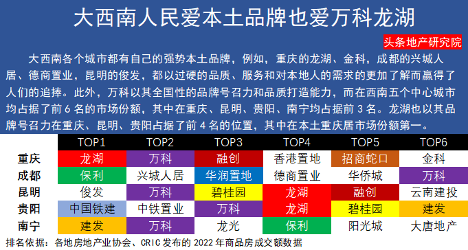 大西南各个城市都有自己的强势本土品牌,例如,重庆的龙湖、金科,成都的兴城人居、德商置业,昆明的俊发,都以过硬的品质、服务和对本地人的需求的更加了解而赢得了人们的追捧。此外,万科以其全国性的品牌号召力和品质打造能力,而在西南五个中心城市均占据了前6名的市场份额,其中在重庆、昆明、贵阳、南宁均占据前3名。龙湖也以其品牌号召力在重庆、昆明、贵阳占据了前4名的位置,其中在本土重庆居市场份额第一。
